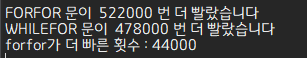 System.out.println("FORFOR 문이 " + forloopSpeed + " 번 더 빨랐습니다");