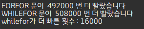System.out.println("WHILEFOR 문이 " + whileloopSpeed + " 번 더 빨랐습니다");